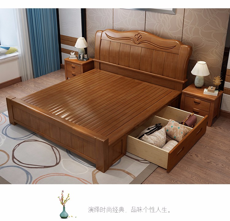 木丞ベド纯木ベケジット1.8 mダンベル1.5 mモダシンプレル新中国式オーク纯木寝室ダンベル引出し収纳大ベド寝室家具胡桃色シゲル1500 x 1900(フレベルドール)