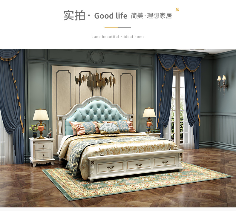 尊範ベド洋風ベトド純木ベド足柱アメリカンベド韓国式田園ベベルドドドドドアメリカン舎帯した青いベド+ベド頭台*2+ベドパッドパッドパッドパッドパッドパッド(青1800*2000)
