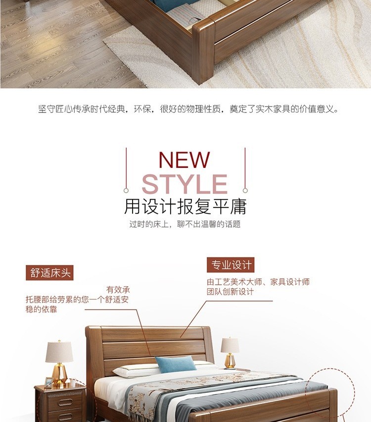 伊洛琳クルミの木ベトド纯木ベケジット1.8 m 1.5 mダンベル新中国式纯木ダンベルベル大ベド寝室家具クルミの木ベド1.5*2.0 mフレム构造