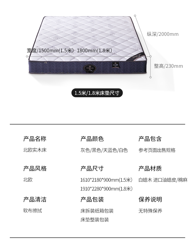 金唯家具ベド純木北欧風ベル1.5 m 1.8 m入力ホワイトワク木モダンプ寝室ダンベル白ワク木シベル150 mm*1900 mm